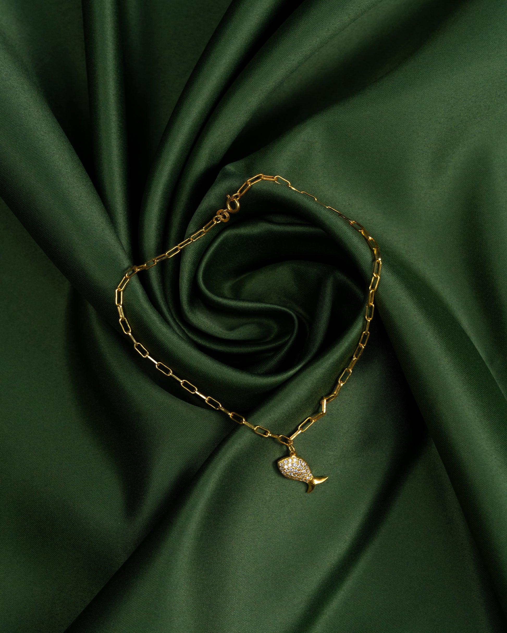 Its golden whale tail charm - delicately set with sparkling stones - reflects the way sunlight dances across oceans waves, a symbol of resilience and flow through life's tides.